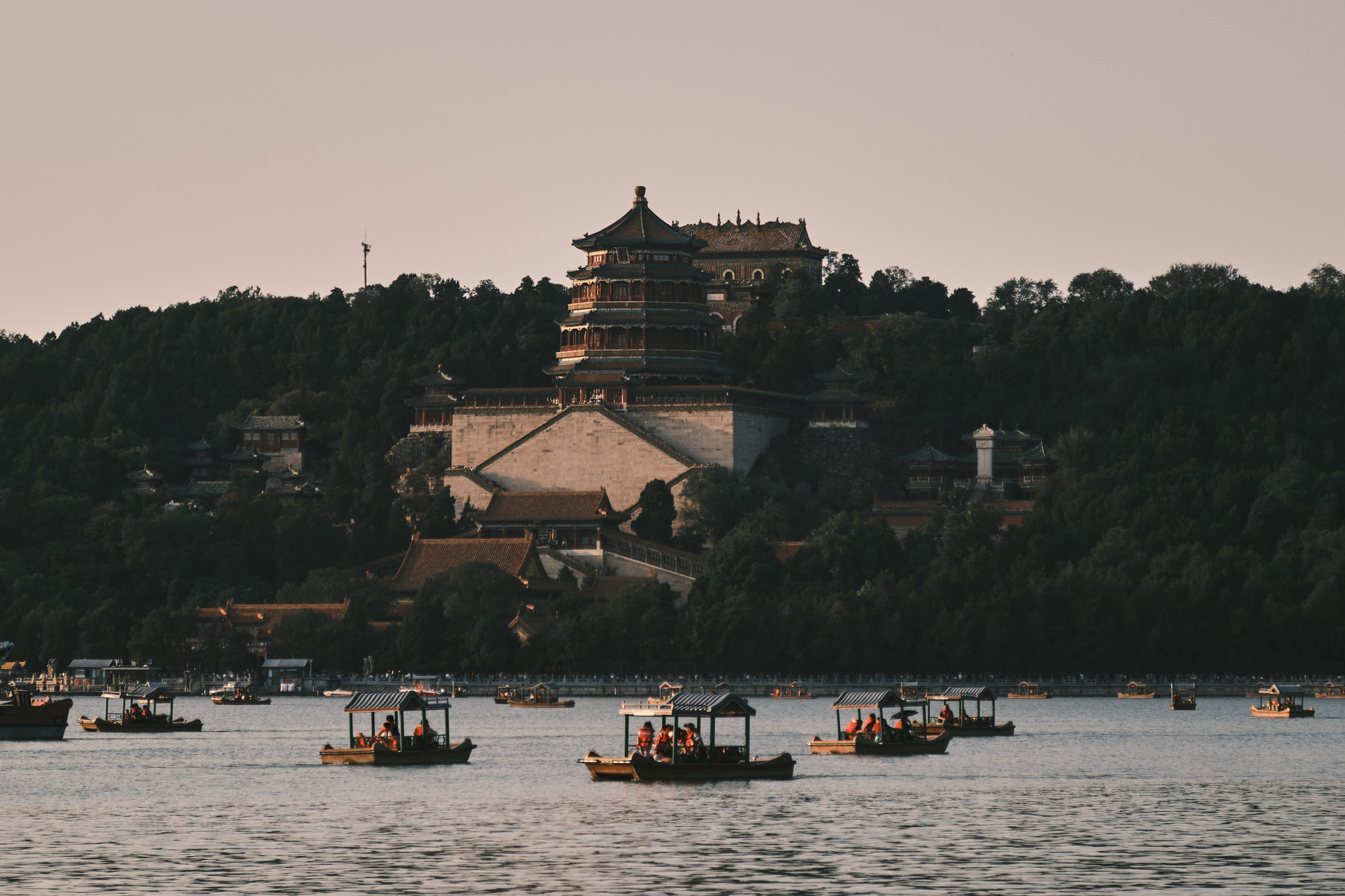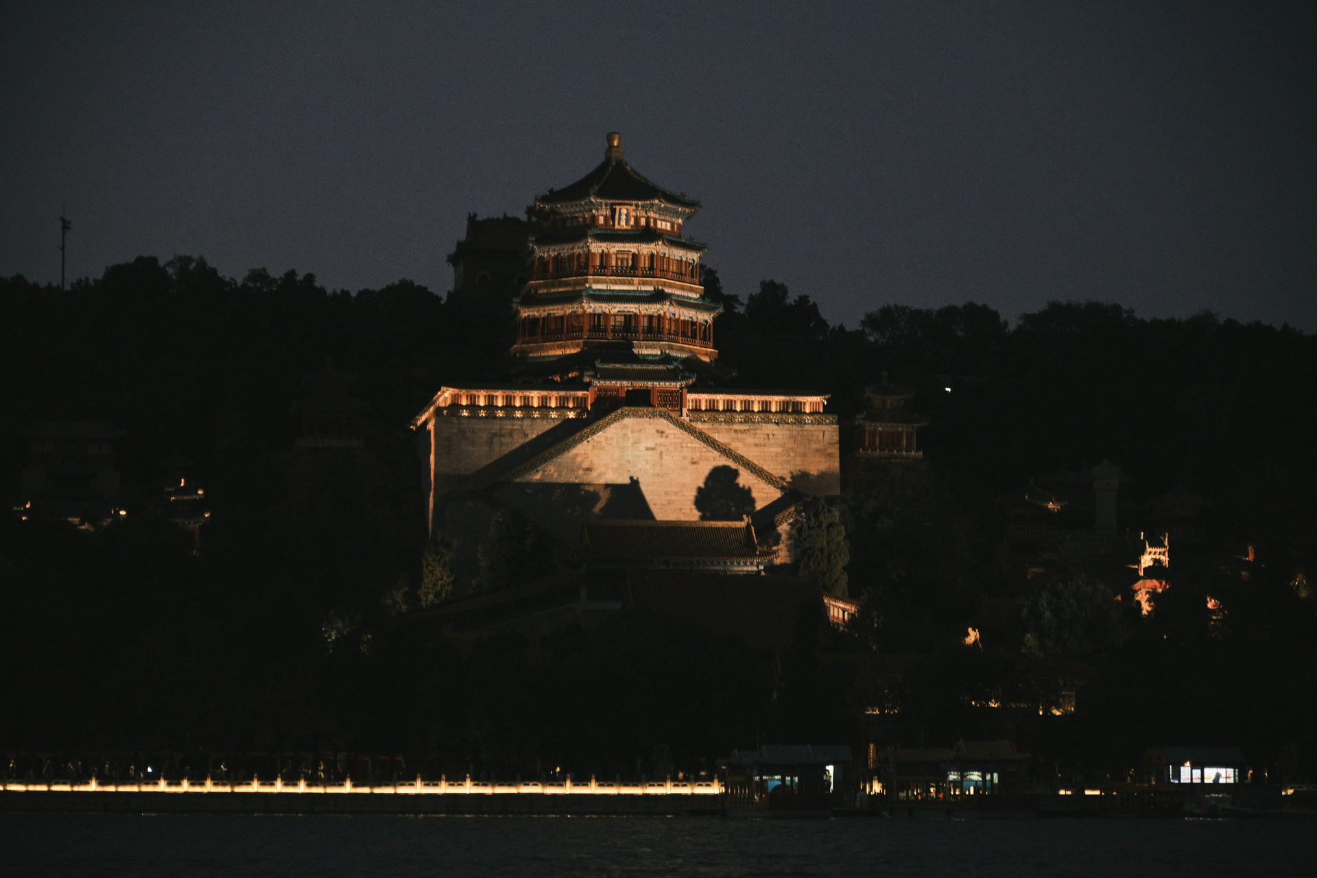Оказалось, что мы попали в разгар национальных выходных — и казалось, будто весь Китай собрался именно здесь. Когда мы наконец сели в лодку, уже стемнело. И в тот момент, среди отражения света от луны и дворца в воде, всё выглядело по-настоящему волшебно.