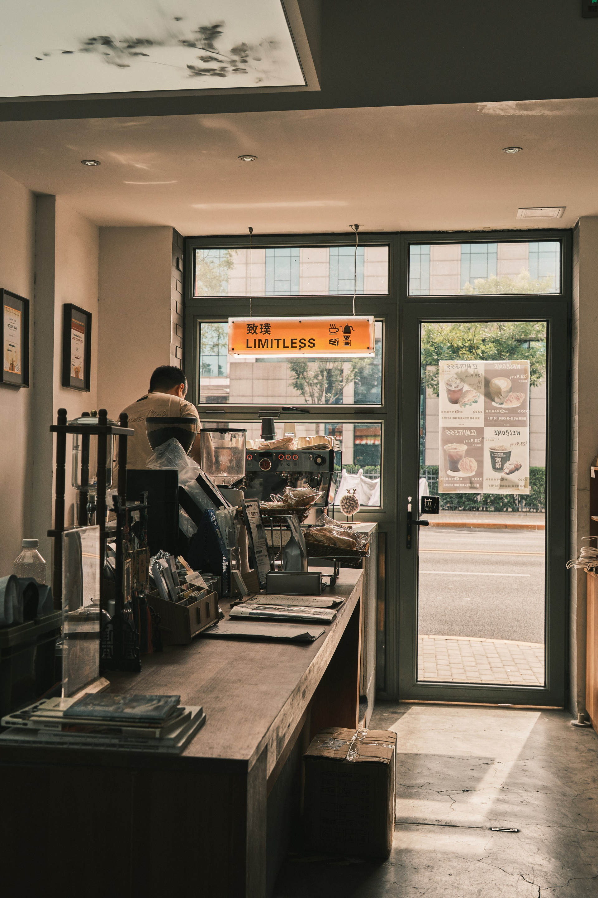 Первой в списке была кофейня Limitless, которая оказалась самой атмосферной в Пекине. Одна половина как кофейня, вторая — как винный бар. На стене — сертификат судьи одного из крупнейших в мире конкурсов Golden Bean World Series — международного соревнования по обжарке кофе, которое проводится в Северной Америке и Австралии. Бариста точно знал, что делает.